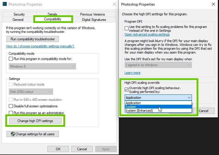 Try closing Photoshop and then right click on the Photoshop.exe or shortcut and change these settings