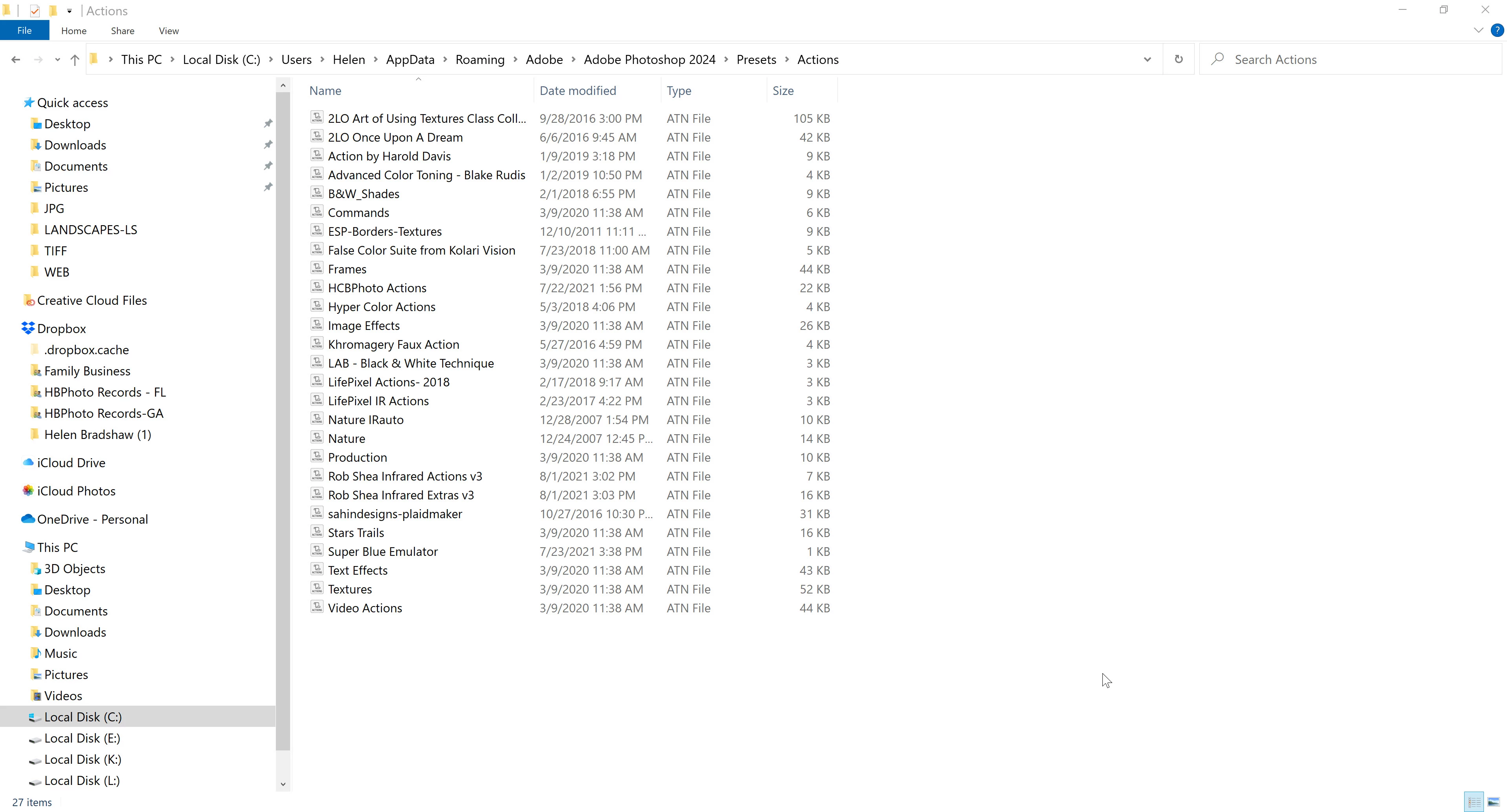 I attached a screenshot of my hard drive directory containing all my actions. I also included a screen shot within Photoshop of the actions that are available.