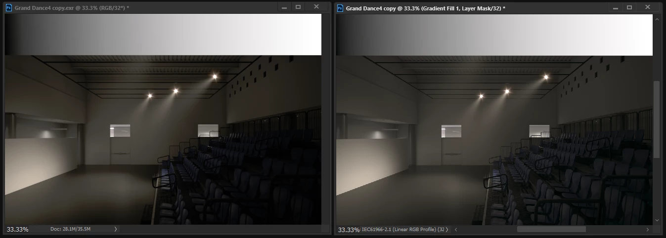 I was trying to do some quick 32-bit compositing in photoshop (I usually work in 16 bit) and was noticing that any image (either opening an exr, starting a new 32bit image, or converting to 32bit) resulted in a darker image than should be expected. Only photoshop seems to exhibit this problem since if I opened the exr in other programs (after effects, irfanview, etc) it looked fine and also match the rendered image from 3ds max. I updated the GPU driver (clean install of 551.23) on the RTX3070 and restarted the machine, all with no change. I was eventually able to narrow it down to the "Use graphics processor" setting in the Photoshop-->Performance setting (the "advanced Settings" options don't seem make a difference). Turning this off let's opened and new 32bit files behave properly. Weirdly it's effect is only seen when the file is opened or created. If I turn the setting off and open the exr the file is fine and I can continue working with it but if I then reopen that file or create a new one the it's messed up. Below is an example. I turned off the setting, opened the exr and duplicated it on the right (the 'copy' one). I then closed the original exr, turned "on" the setting and reopened the exr which resulted in the darker image on the left (mainly some crushed shadows). I then added a gradient ramp at the top just to see what's happening and you can see how the gradient is no longer smooth, especially at the darker end where there is a noticeable 'hump' as it turns to black. See the attached screenshot for an example.
