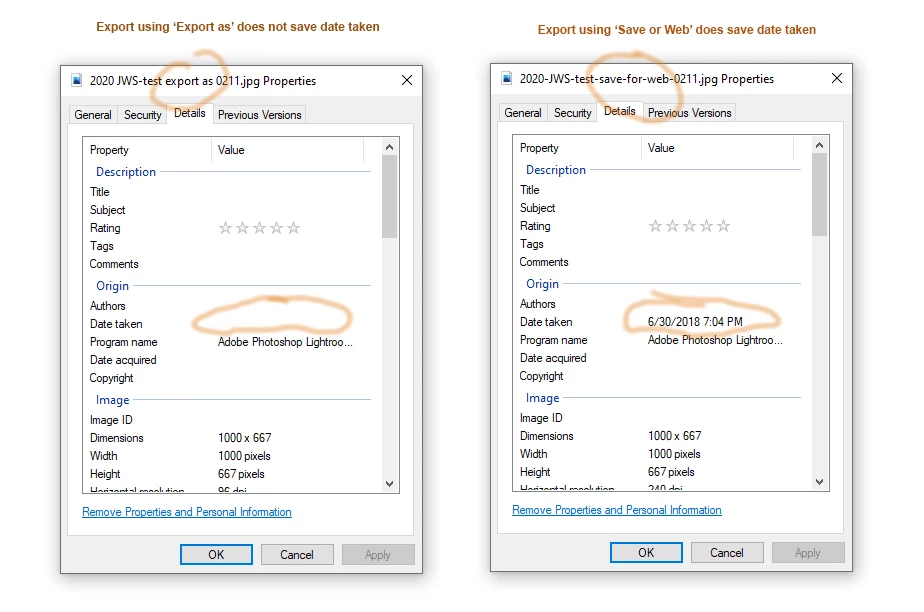 I started using 'Export As' recently instead of 'Save for Web' and just noticed that the date taken is not saved. If the file is viewed using the Windows Properties the capture date is shown only if I use the legacy 'save for web'. I have made sure that the 'copyright and contact info' is checked in the 'Export as' dialogue on export but this makes no difference. I would like to continue using using Export As but I need the date taken/captured to be saved. I've attached screen shots of the properties boxes of the file saved both ways. Thanks. Jim