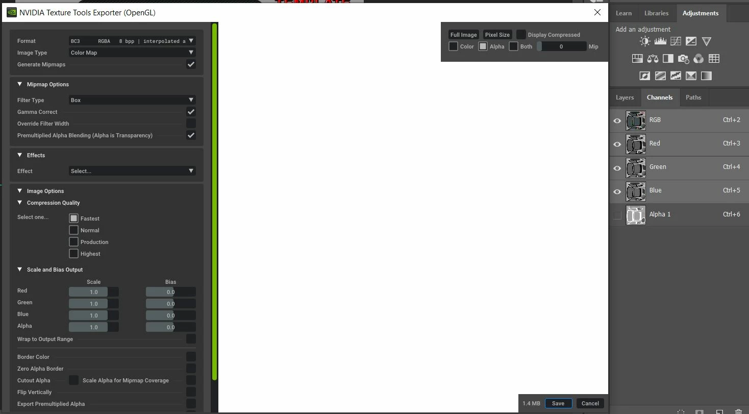 since I use Photoshop CC 2019 I have problems with saving DDS files that have transparency defined by the Alpha channel. The problem consists in the alpha resulting all white while previewing with the DDS plug-in, meanwhile in Photoshop it's correctly painted. Anyone had the same issue and solved it? Any help would be appreciated...