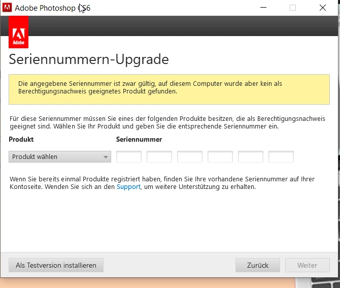 Usprunglich habe ich CS2 mit Upgrade auf CS3 gekauft und später das Upgrade auf CS6. Ich muß also immer alle Versionen installieren. Bei CS2 & 3 hat das alles reibungslos geklappt, aber bei CS6 kommt immer nachfolgende Meldung. Früher gab es für solche Fälle mal eine Telefonnummer, die man dafür anrufen konnte, wie kann ich das denn heute machen? Ich finde auf der Adobe Hilfeseite nichts oder ich suche falsch.