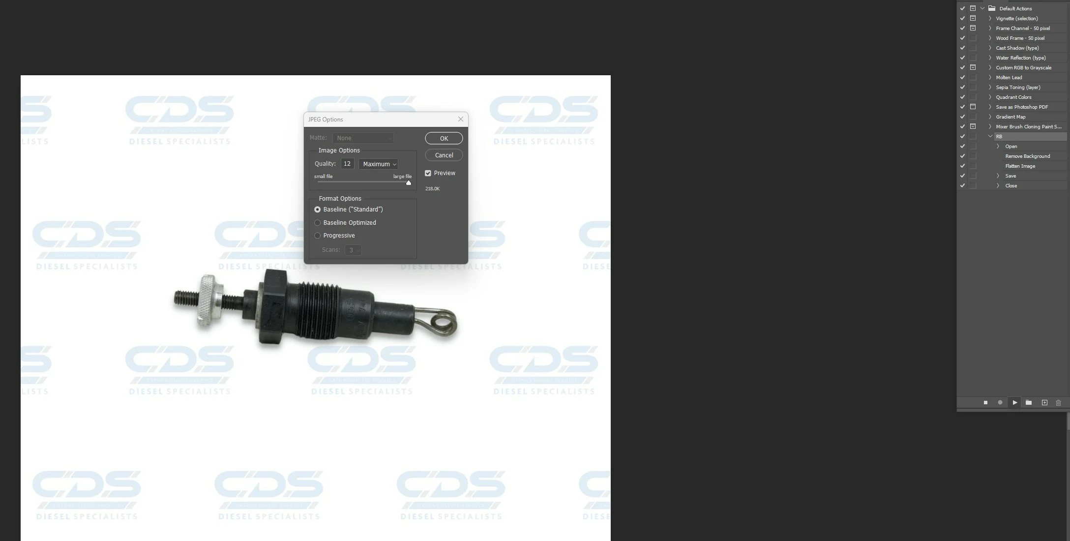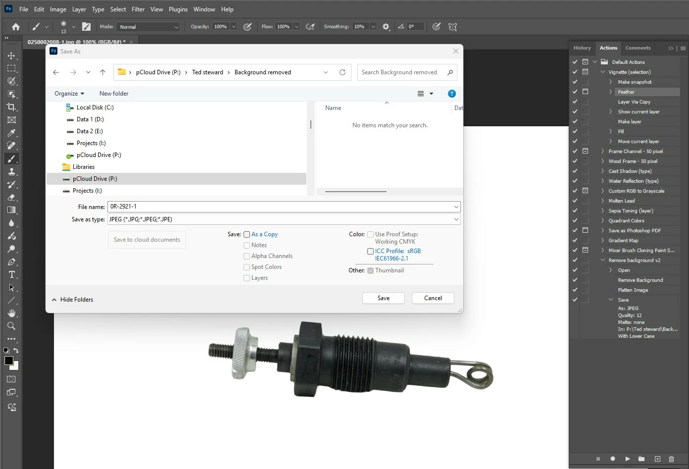 I created a new Action called DB to just remove the background, merge to get a white background then save and get the pop up, which is not part of the planned action. All I want to do is save as a jpeg.