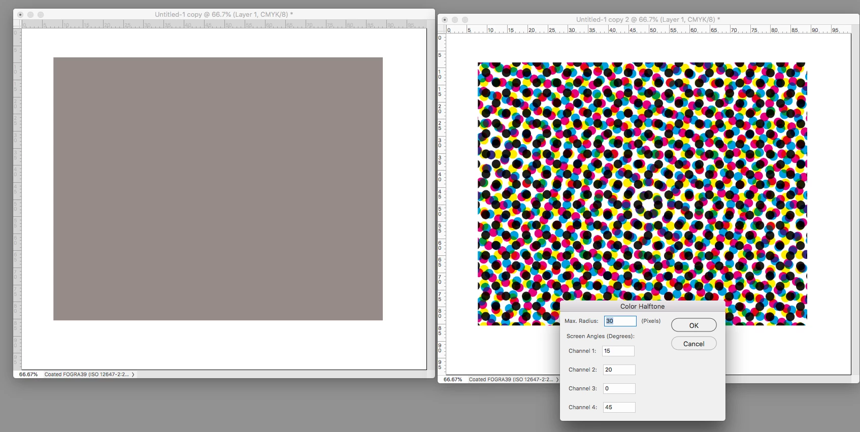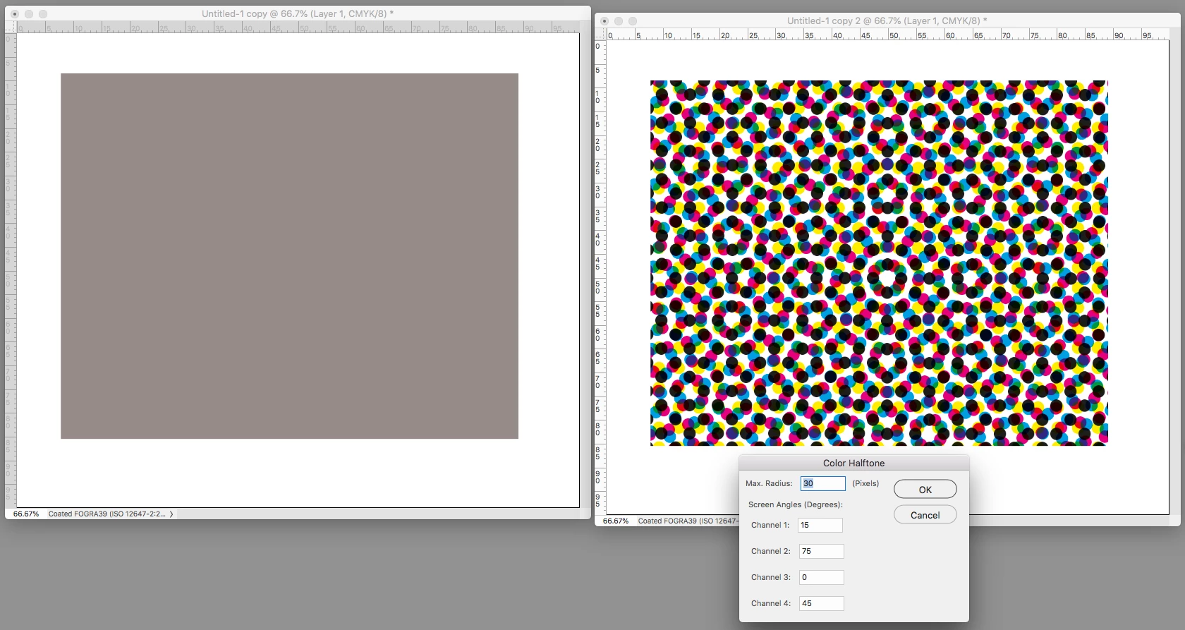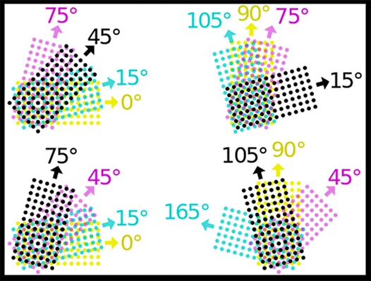 In order to avoid a disturbing visual interference pattern created when sequential halftone dot patterns are overprinted, screen angles should be 30 degrees apart. Unfortunately, since the angle repeats every 90 degrees, we can only provide a 30-degree interval for three of the required four colors (0, 30, 60, for example…90 repeats the pattern). We provide for the fourth color by inserting it midway between the others – a 15 degree interval -- creating a moiré.