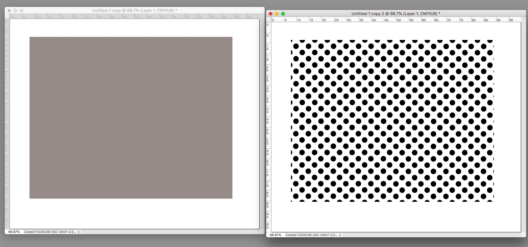 To hide that disturbance we assign hard-to-see Yellow to that spot. So, Yellow is usually angled at 0 or 90. It makes the moiré invisible -- with an important additional benefit: since yellow is difficult to see, we are not aware of the vertical and horizontal line of yellow dots it creates. (When I say hard to see: in some printing plants you will probably find a dark blue glass about the size of an index card on a table at the delivery end of the press. The pressman may hold that to his eyes to increase paper-to-ink contrast when checking the printing of a separate yellow halftone sheet in the set.)