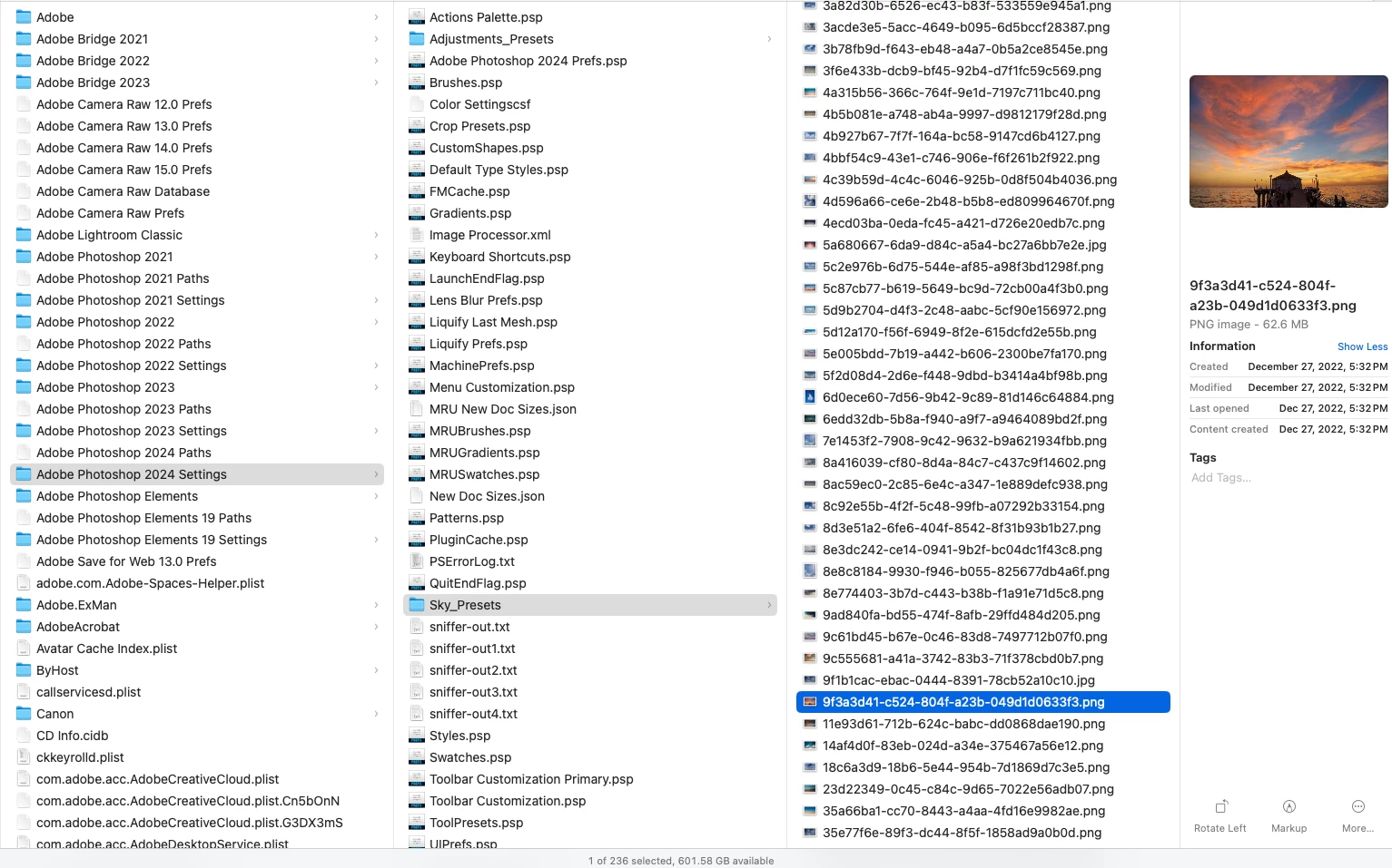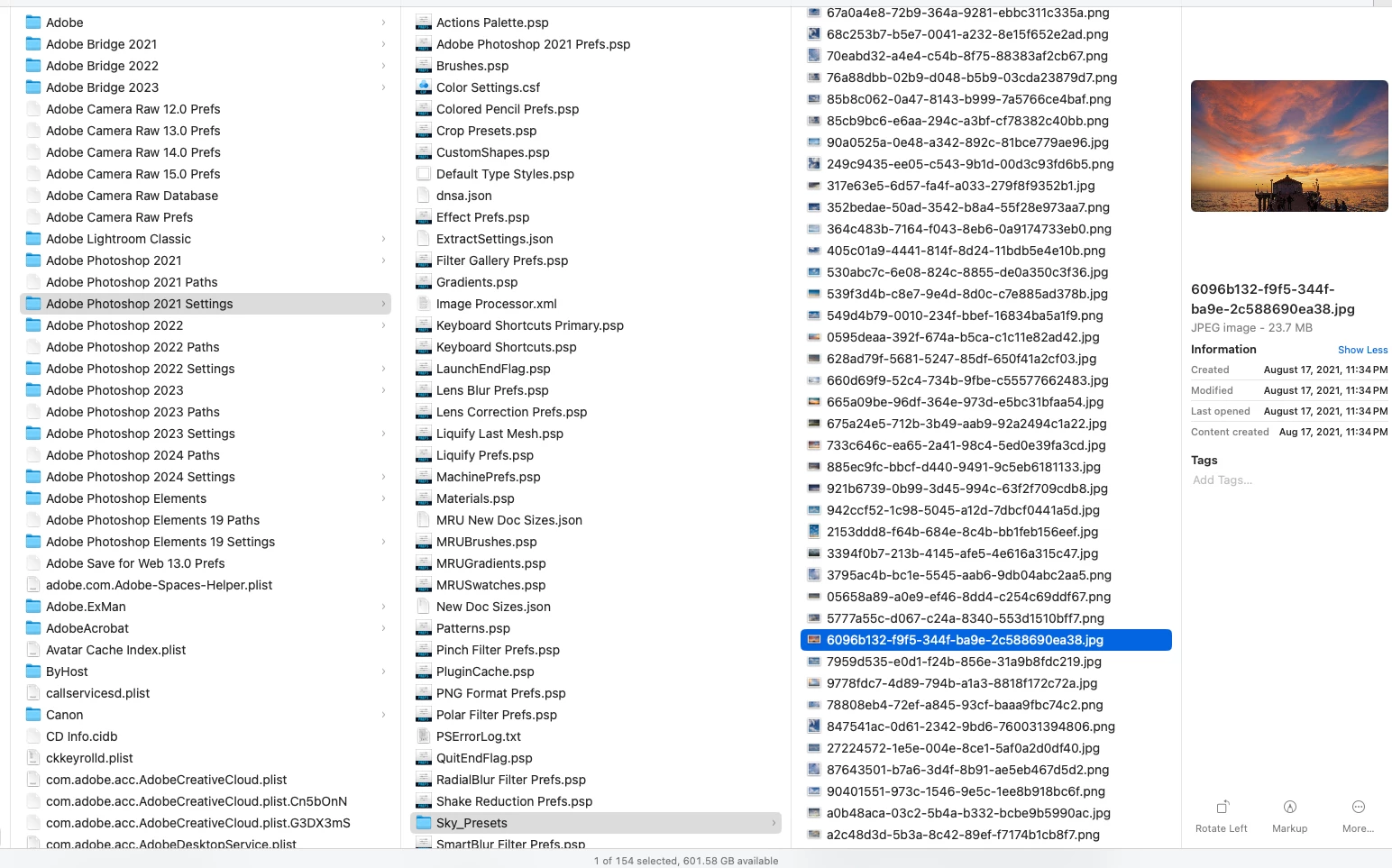 Is there any problem with deleting the Settings folder from older verions of Photoshop in my Preference folder in my OS Library? Specifically, I noticed that my Sky Presets folders are fairly large (about 4GB). I have the folders from Photoshop 2021-2024. The latest versions has more files than the older ones, but the files themselves are the same, image-wise, although the same image file in each year are assigned a different random name. See screenshots. I was doing some housekeeping, and thought that freeing up 20GB couldn't hurt. Or could it?