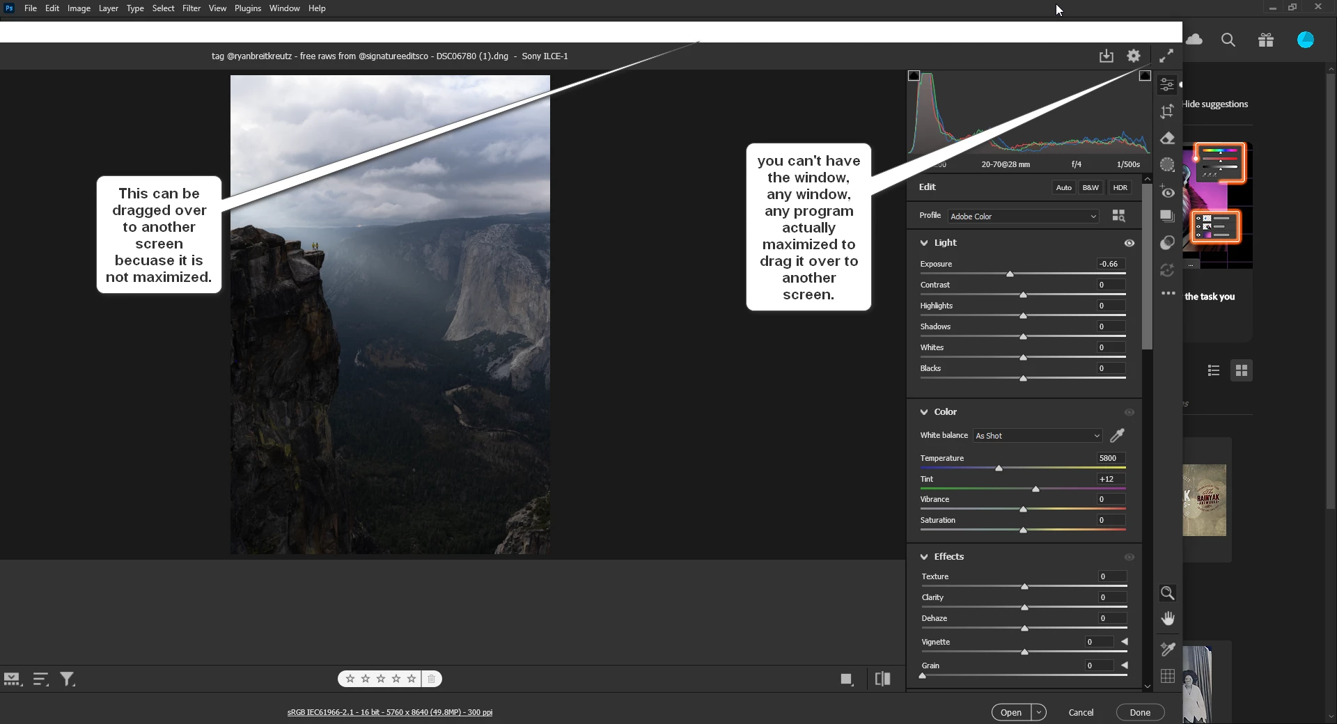 Déplacer la fenêtre camera raw