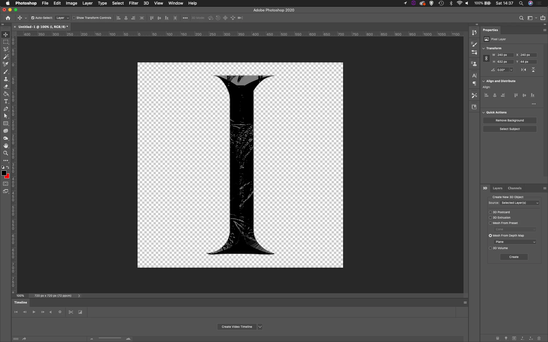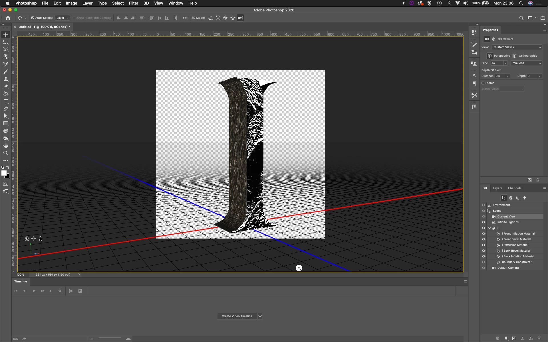 But I want the end result to be an extruded I with the effect created by the depth map on each surface of the letter.