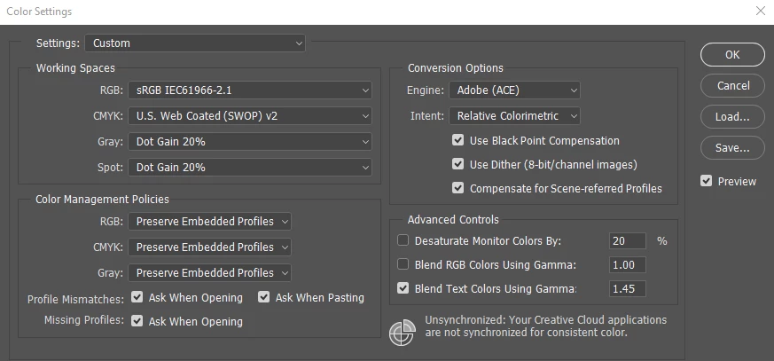 My current Color Settings are in the image below. I have viewed all options in ‘Proof Setup’ - nothing fixes the issue.