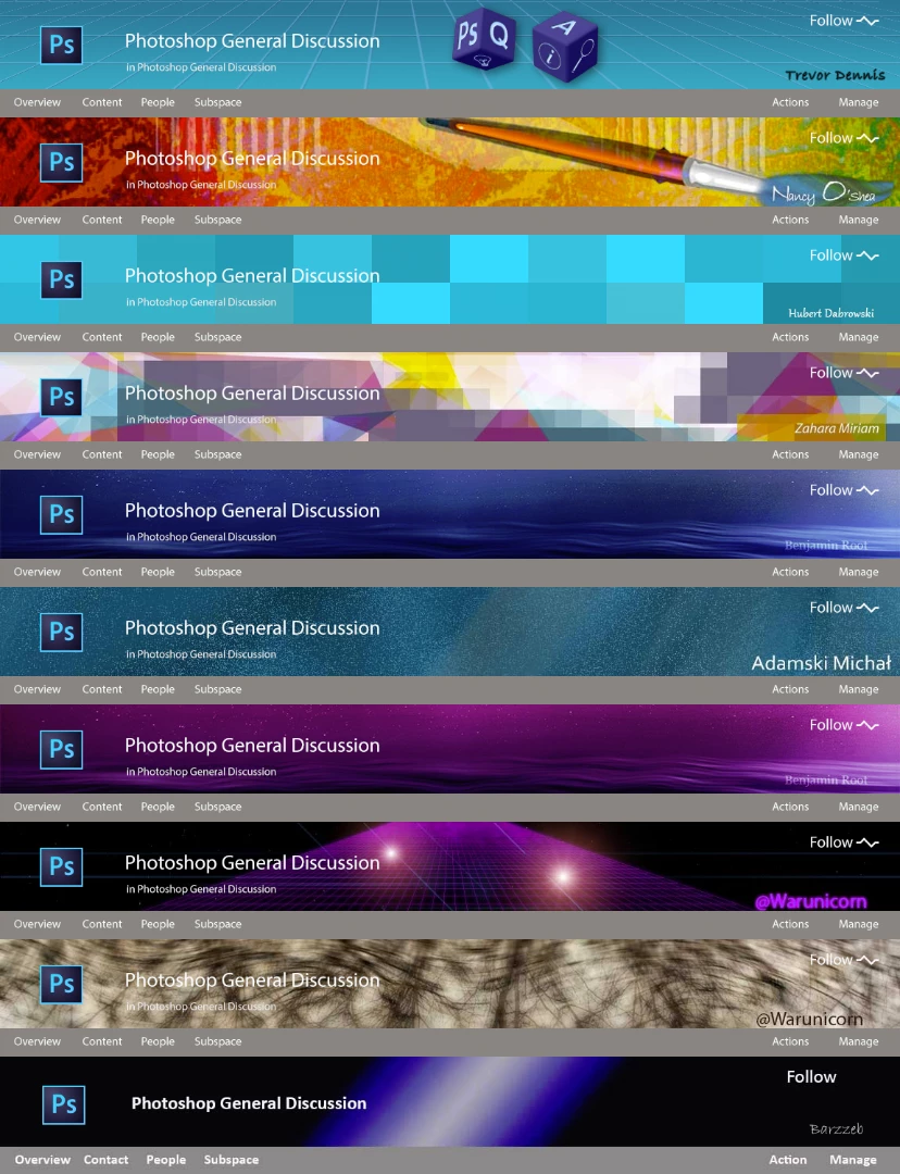 Using the template in this post, submit your Photoshop Forums Banner design by attaching your image in a response to this thread. We’ll then select the best submissions and use them for our Photoshop Forums banner image. A new banner image will be selected by an internal Adobe committee every 3 months and used in the Photoshop forums.