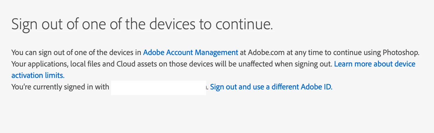 You <Mod: insult removed> at Adobe once again created yet another hurdle to seamless and comfortable use. I am trying to launch PS on my laptop when I am faced with a message saying that device limit has been reached. I used to be able to log out from my other machines right there and then but now you software geniuses suggest I look at a my account management page. Where do I log out? It just takes me to the page. What does one do with this? It's enough I have to log into my old email every time I open PS for some reason I can't opt out of your stupid 2fa, but this takes the cake. Guess what I can't even use the web version "due to an unknown error" how wonderful.