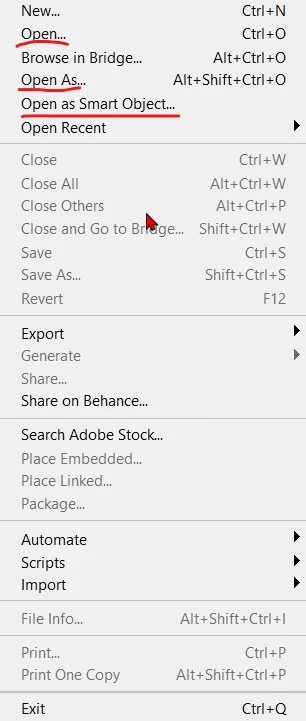 difference Open, open as & open as smart object