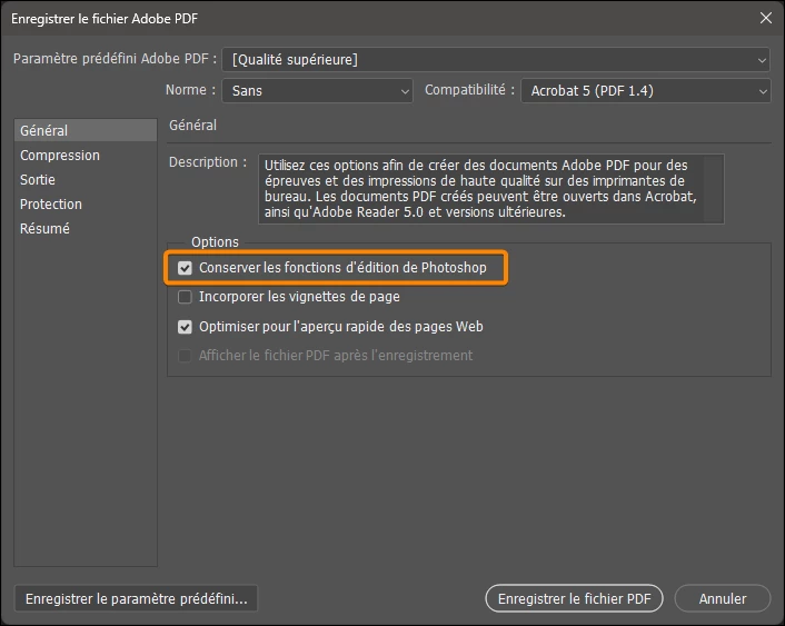 Je viens de refaire mon CV sur Photoshop 2025. Lors de l'enregistrement en format PDF, les puces/listes dans mon texte disparaissent. Quels réglages faut-il utiliser pour palier à ce problème ?
