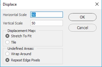6. Choose Filter > Distort > Displace. The default numbers of 10 for Vertical and Horizontal Scale usually work very well. For greater displacement,15 is satisfactory, as well. Radio buttons should be set to Stretch to Fit and Repeat Pixel Edges. Click OK.