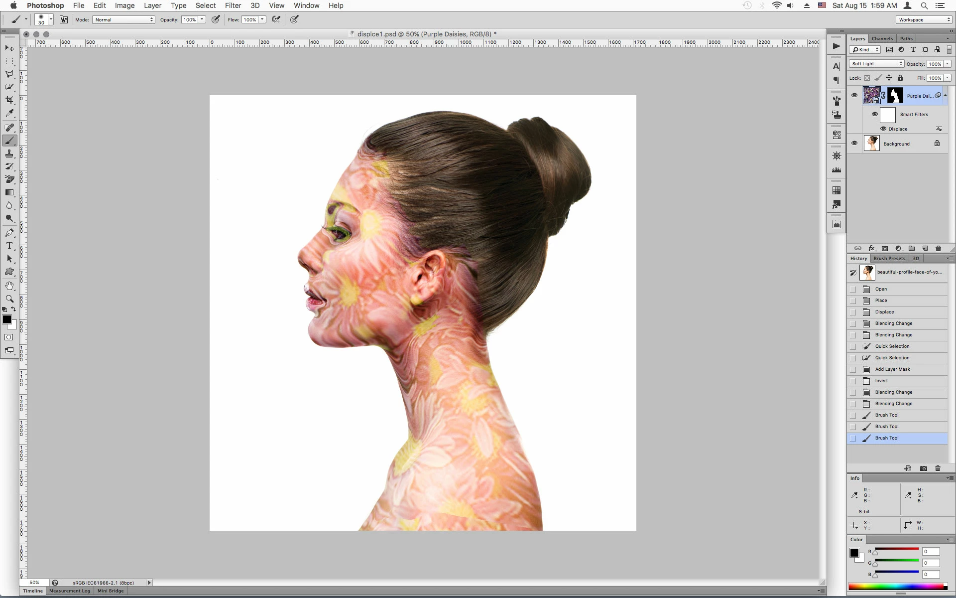 I've duplicated the model's face as a new file,put it in grayscale mode at 8 bit, upped the contrast, applied a slight gaussian blur then saved it as a PSD file. Then I've put another layer on top of the colour original image (I've tried different textures and also type), gone to Filter-Distort-Displace and selected the model's displacment map file. I've chose 10 and 10 for horizontal and vertical, stretch to fit, repeat edge pixels (have also tried it with wrap around). Nothing has worked 😞