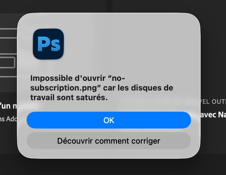 Since I reinstall macOS (26.2) on my macbook Pro (M1 Max 2021 - 32go RAM) Illustrator and Photoshop (maybe all adobe products, didn’t try yet) are acting bad. For photoshop, first start, I get this screen when I try to open a simple PNG… I have 680Gb of brand new free available space and it tells me drives are staurated.