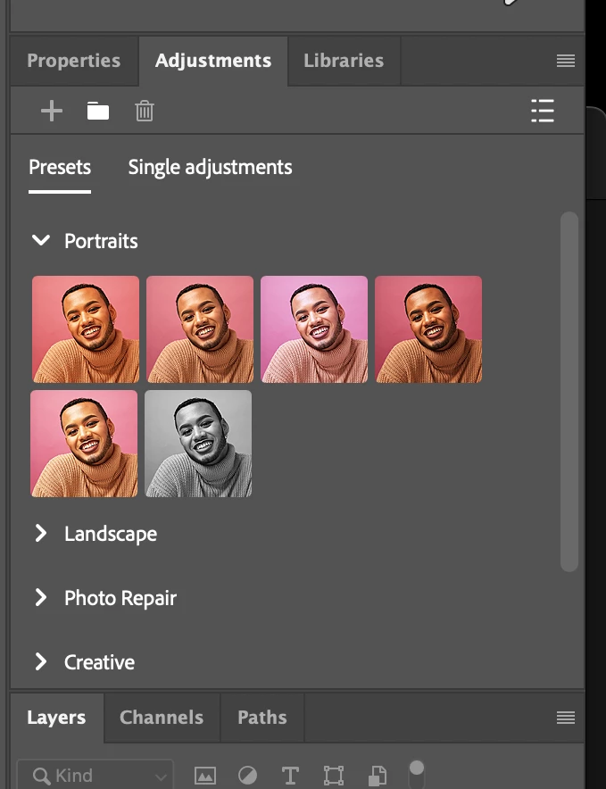 I do not have the "adjustments presets" options available in v26.9 on Mac. I tried going to the dropdown to select "modern view" but i dont have this option either. Somebody said if i go to Layer there should be an option to add "new adjustment layer" but i dont have this option either. So i'm very confused what could be specifically issues with this specific feature set. Not sure if its relevant but in another thread I read that the adjustments features have a "call home" feature. Not sure what this means but maybe something could be preventing access from connecting to the server? But i disabled firewall and gave full disk access to photoshop and this still persists. And yes, i have tried re-installing, deleting .plist files, installing older version, no luck. I am new to photoshop so I cannot comment on whether it worked before or not.