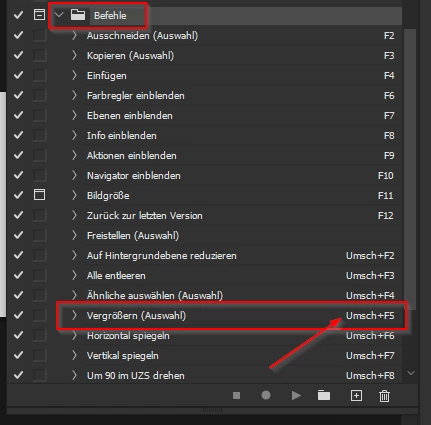 But if I press Shift+F5 the Expand... function from the Select - Modify menu will be executed. I take a look on it and found there's a appropriate action in the action set "Befehle".