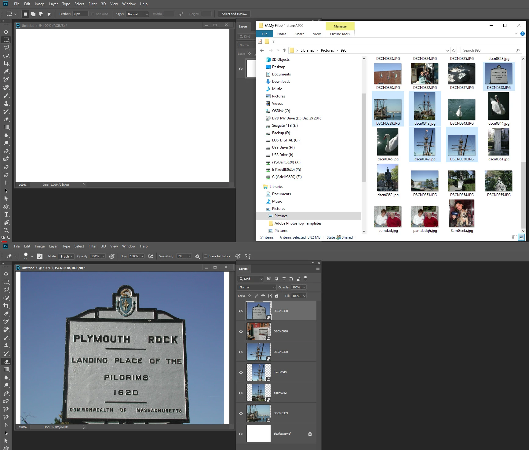 Then Opening Windows File explorer I navigated to a folder containing  JPEG images.  I select some images  by clicking on the when I have the control key  pressed.  Once I have all the images I want to use highlighted.  I Drag them over on top of the open document in Photoshop and drop them.