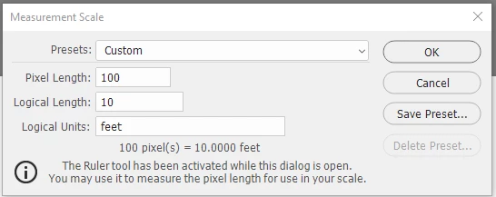 I am trying to draw a rectangle and/or line using the same scale as I set in the analysis toolbar. So instead of one inch (or pixels) = 10 ft. 1 inch = 100 ft. I know how to use the ruler tool to use the measurement scale. I have done that. But after I have set the scale I want to be able to draw a rectangle or line using the same scale as I set in the analysis custom measurement. When I use a rectangle marquee I am able to click and drag a box that is close but I cannot figure out how to input exact measurements using that scale or draw a line using that scale. When I use the ruler I can click and drag and figure the angle. But then I have to draw over them. When I use the rectangle marque or the rectangle shape tool and go into the transform menu it is based on the default not the custom scale. Help. I have been looking for days. I think I have seen this in medical images (at least the lines). TYIA