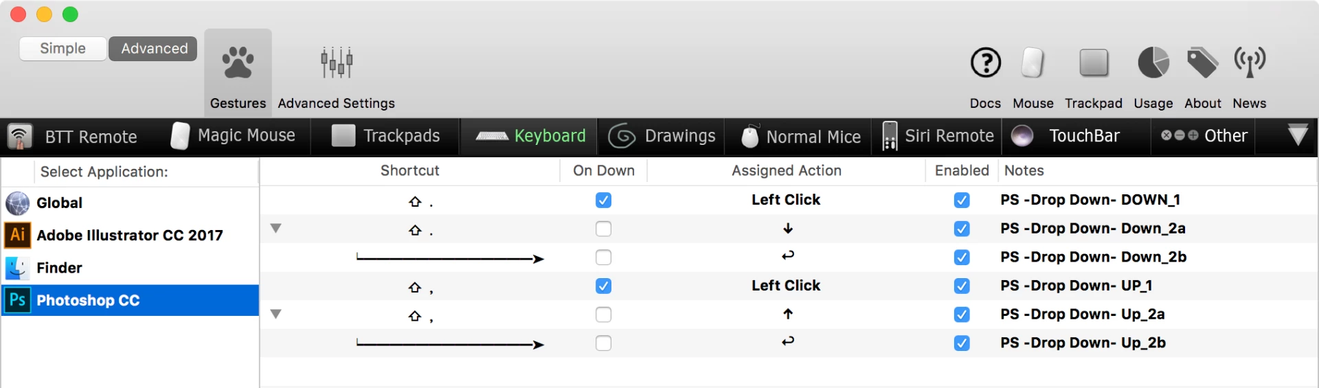 The order and checked/unchecked option of "On Down" are crucial to making it work.