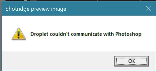 I created a new droplet that reduces the size of a file and saves as jpg in a directory. Pretty simple. But I keep getting this error "cannot communicate with Photoshop". I tried running as administrator but that didn't work either. This also happened on PS 26.7, so I upgraded to PS 26.11 hoping it would fix the issue. Remade the droplet with 26.11, and it still persists.