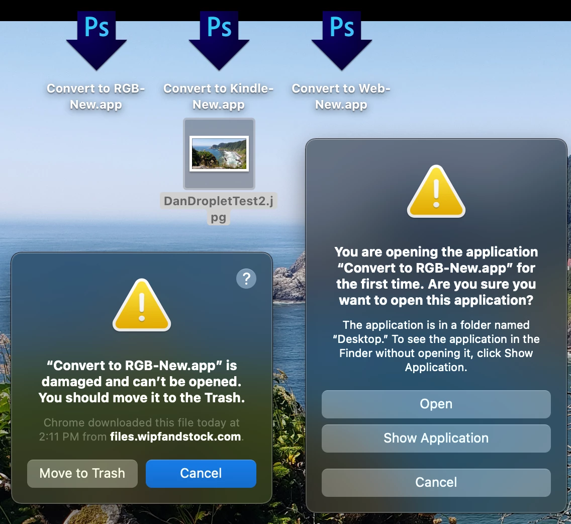 However, if I attempt to send a dropplet to a user, they always see these two errors, regardless of any combination of options is chosen in either error message. Issue persists regardless of what Mac said Dropplets were made on, and always work fine when created manually using the same .atn saved actions.