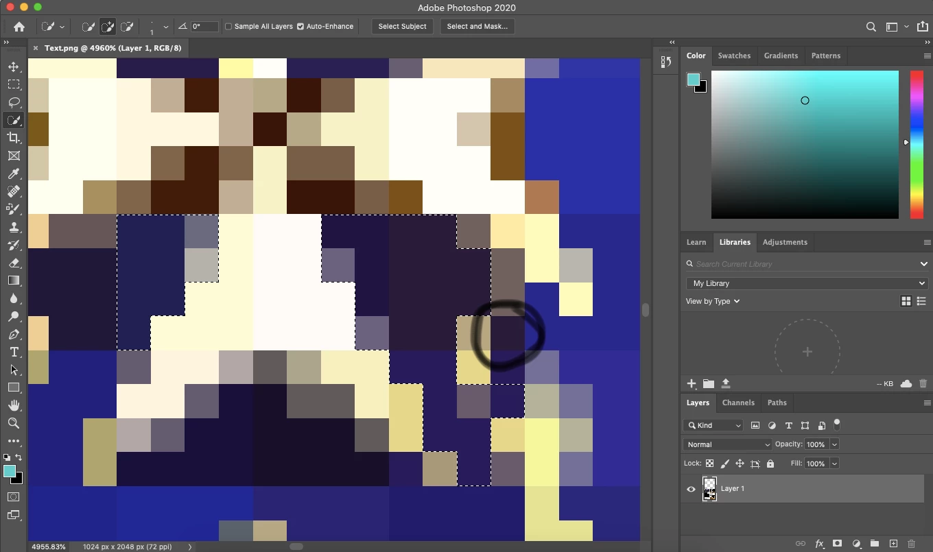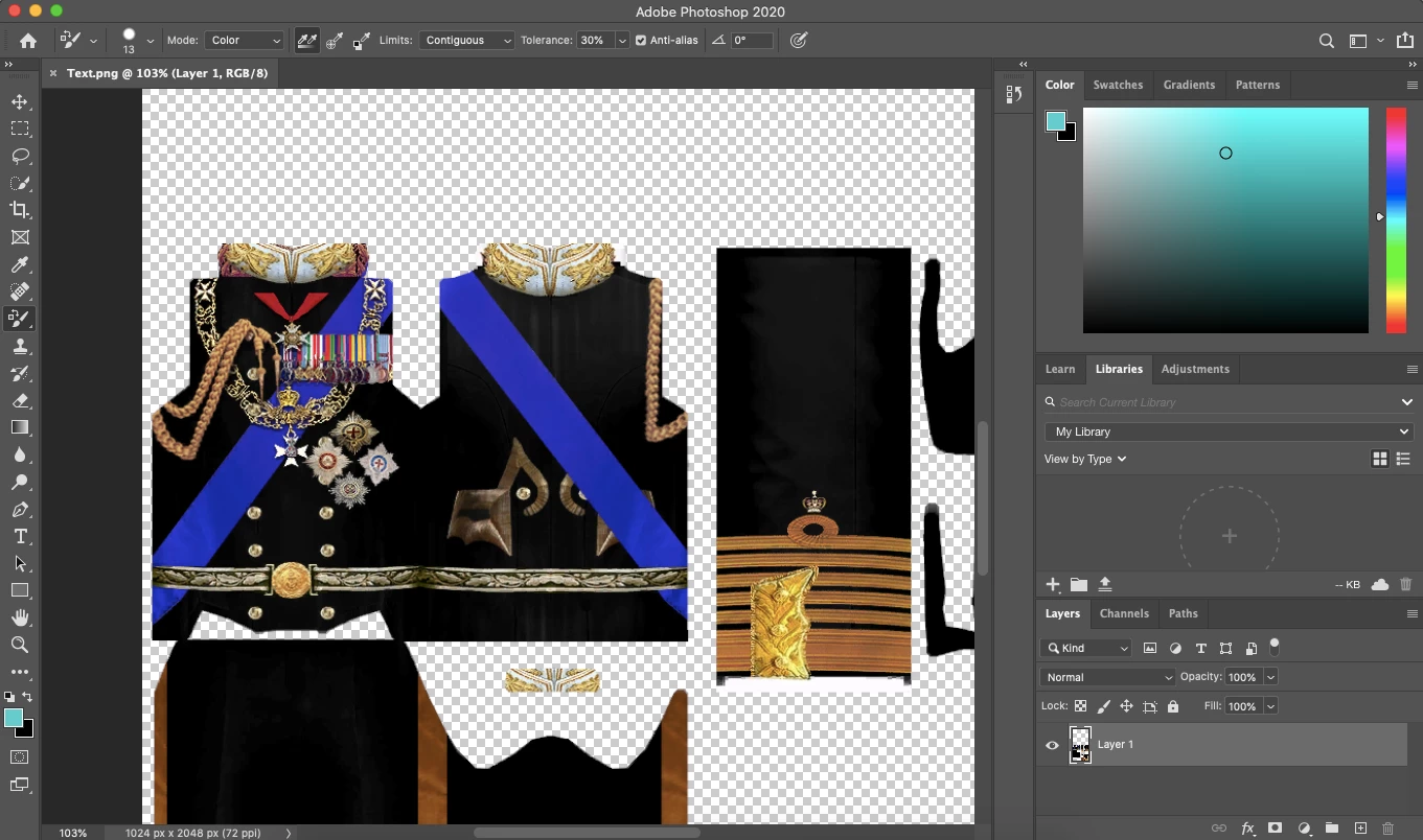 Hello all! I am really struggling with trying to recolor this sash in the this photo. As you can see, other things go over the sash. I have tried the quick selection tool to select the sash, but sometimes it overselects into the items on the sash. I used the quick selection remove tool and then it would remove to much, even if I zoom in and click pixel by pixel. For other items I have recolored, I use the quick selection tool to select what I want recolored, then use the hue/saturation adjustment layer. But with the quick selection, Sometimes it selects more than just the pixel I am selecting, or removes more than the pixel I am selecting. I have included pictures of the sash. Also there is a picture of the sash zoomed into where I am clicking the pixels. The circled pixel in the picture, when I click it no matter how many times, it WAY overselects. Then when I go to deselect the items that the quick selection tool selected that I didn't want selected, it will deselect that pixel even though I haven't manually deselected it. I hope this makes sense! I am a newbie and photoshop haha. I have also tried the color replacment tool to color over the sash in the color I want, but it comes out way to dark. And too brighten it up I would need the quick selection tool to only select the pixels I have recolored, which obviously isn't working for me. I just need to be able to select the purple and blue pixels only on the sash, without the quick selection tool selecting the brown and tan pixels too!!
