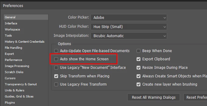 Untick Preferences > General > Auto show the Home Screen, then restart Photoshop. If that doesn't help, try resetting the preferences.