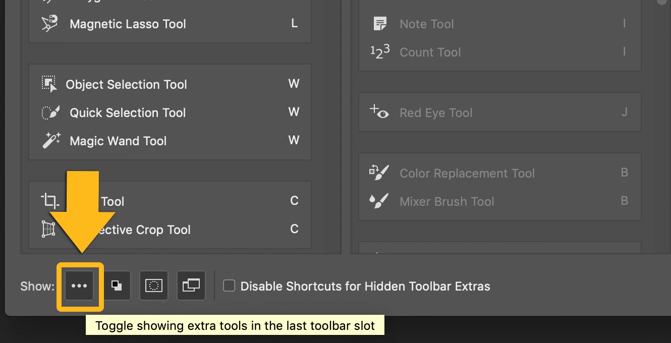 I don't know what I did, but I click the 3 dots and then accidentally clicked somethign else and now the 3 dots icon is gone. I've tried resetting my toolbar and all my settings, it's not coming back. I don't really want to unistall photoshop just to get a tool back, but will if that's the only solution. Can anyone help? Screenshots attached of what I've got (light grey) vs what I'm missing (dark grey).