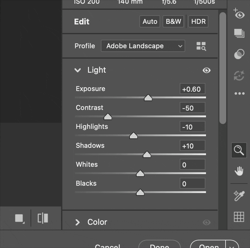 •File>Open>Select a Camera Raw File (5D mk III .cr2)