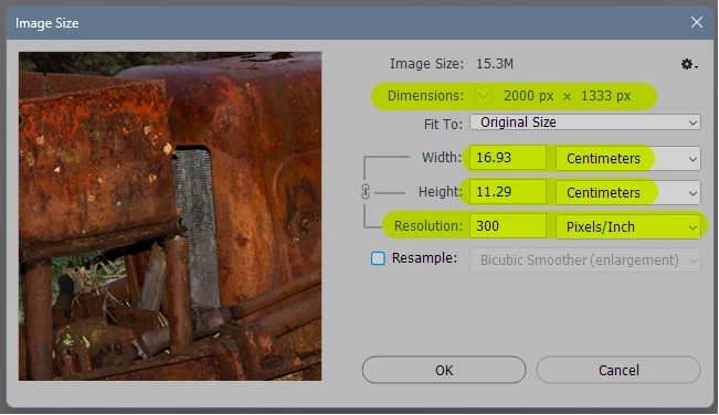The file is 2000 x 1333 pixels, and I decide I want a density of 300 ppi for this.