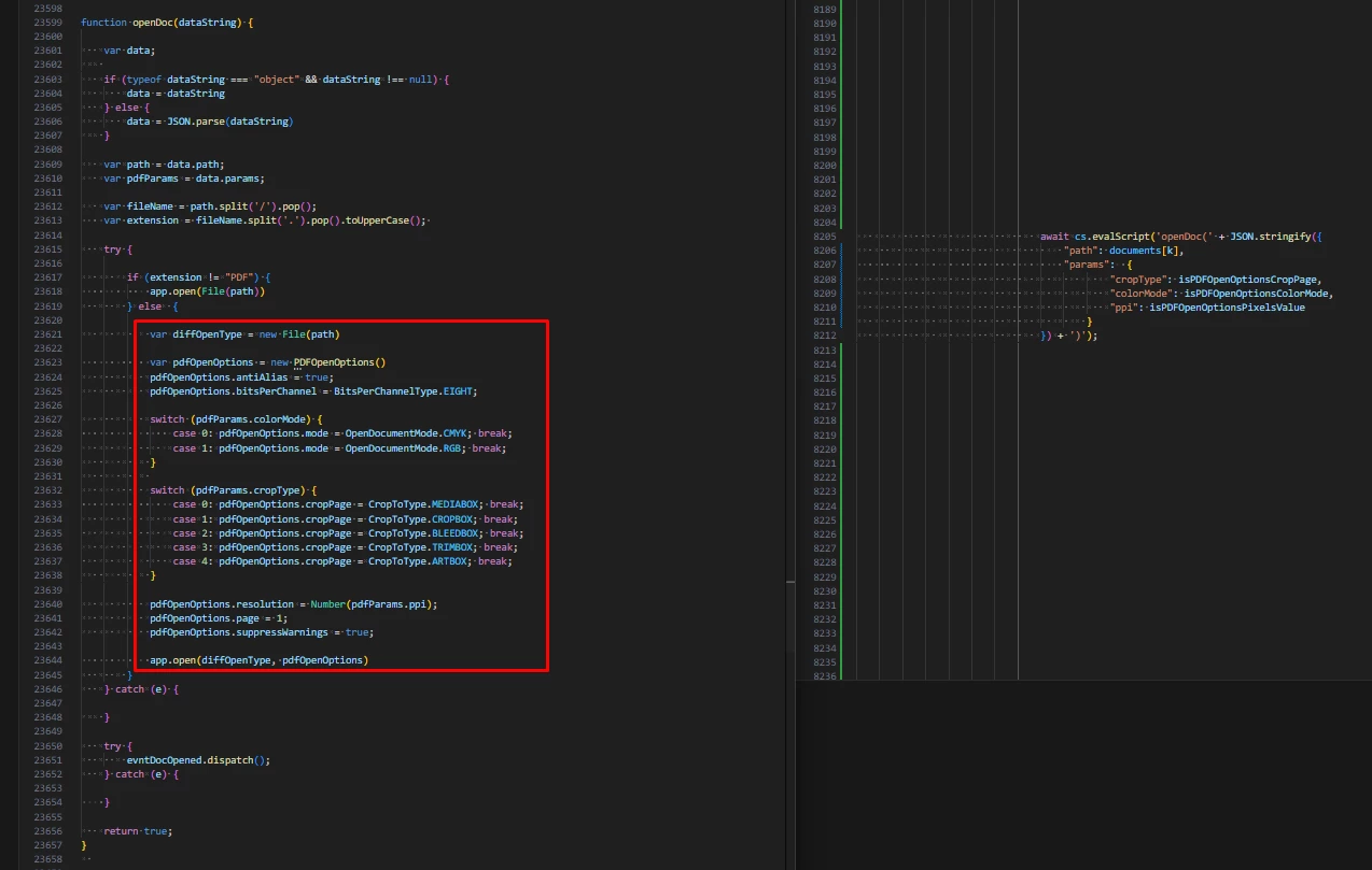 On the left, there is a document-opening function. If a PDF was saved in Photoshop, it will open without any additional parameters. However, if the file was created in Illustrator or InDesign, the specified parameters will be applied when opening it.