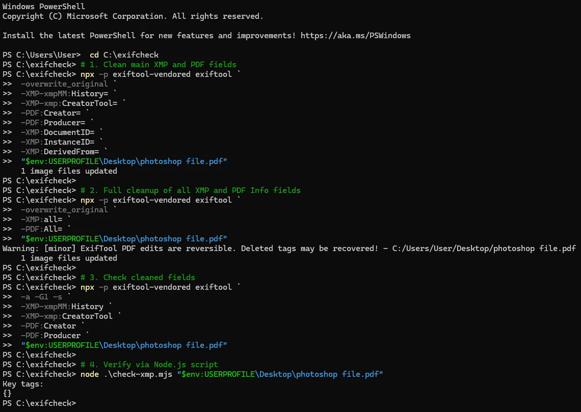 In my opinion, it’s not possible to change this behavior directly through JSX. However, this isn’t a major problem if you know exactly where the relevant data is stored. It’s possible to use a Node.js library to modify or remove the necessary entries before opening the document — most likely in the XMP metadata. I haven’t worked with this before, so I’d appreciate it if you could recommend which Node.js library to use and how to delete or modify a specific line, if that’s possible in the context of this task.