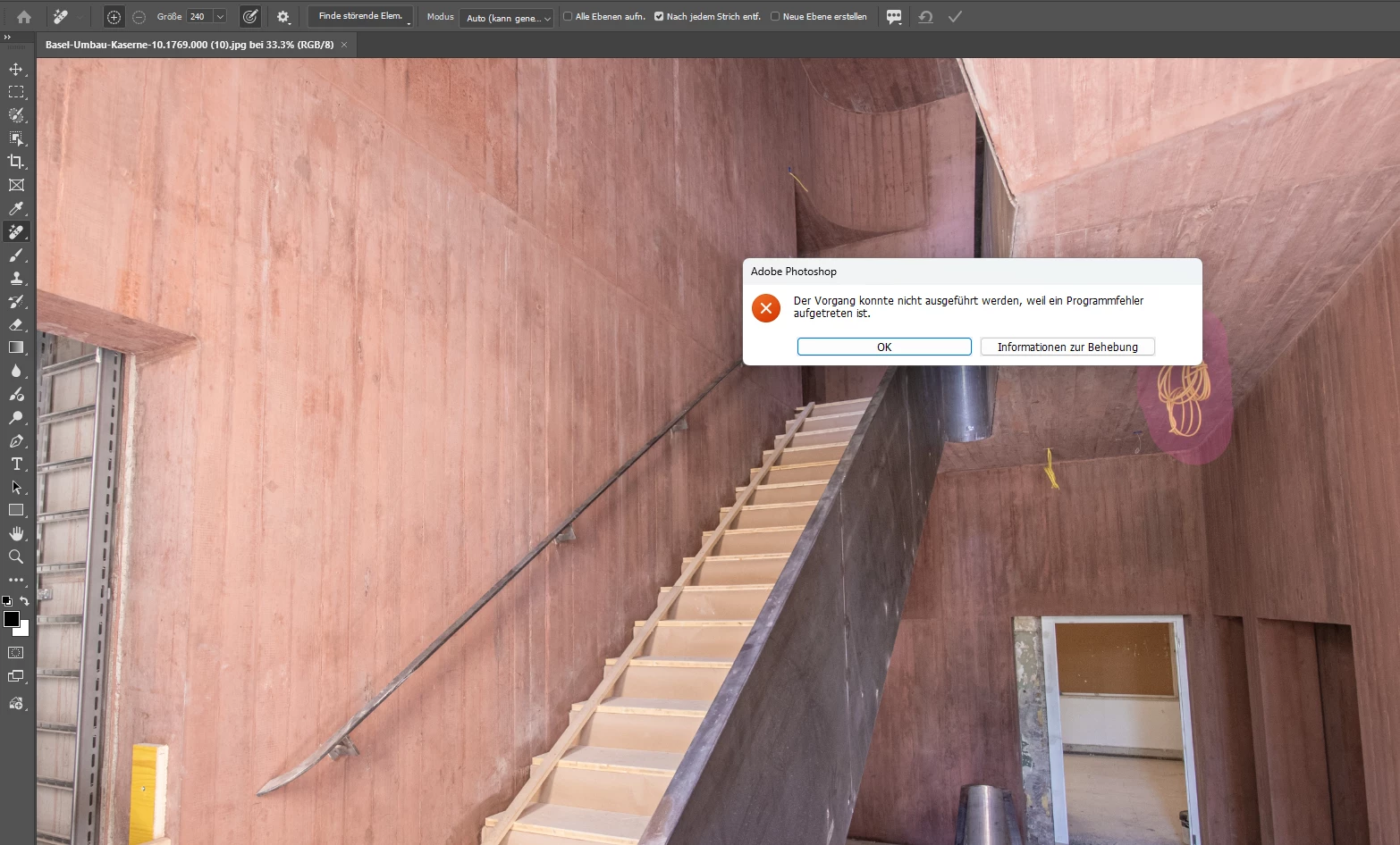 Das Entfernen-Werkzeug in Photoshop funktoniert seit dem Update nicht mehr. Wenn ich das Werkzeug nutzen möchte erhalte ich immer einen Programmfehler ohne Spezifikation, siehe Printscreen.