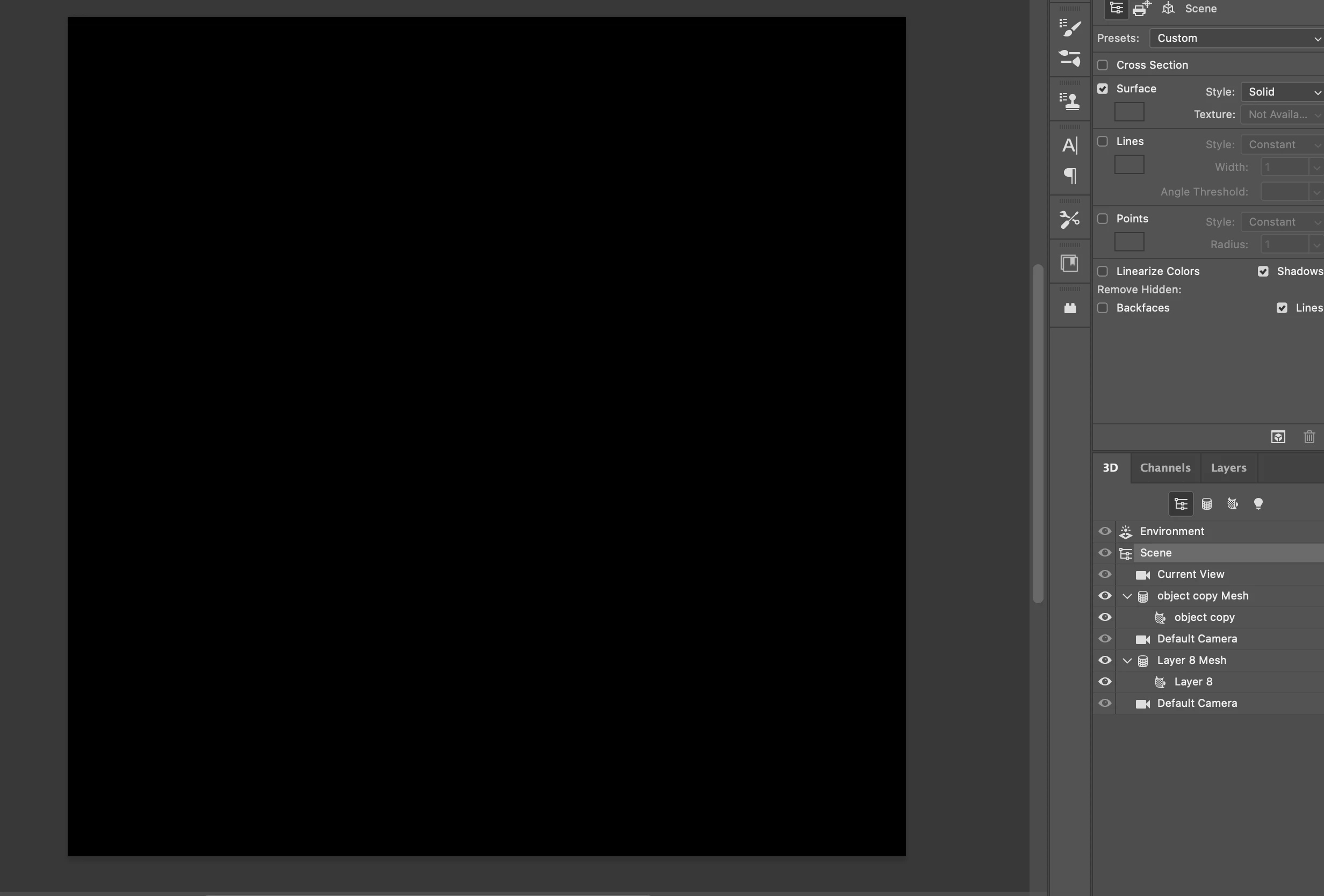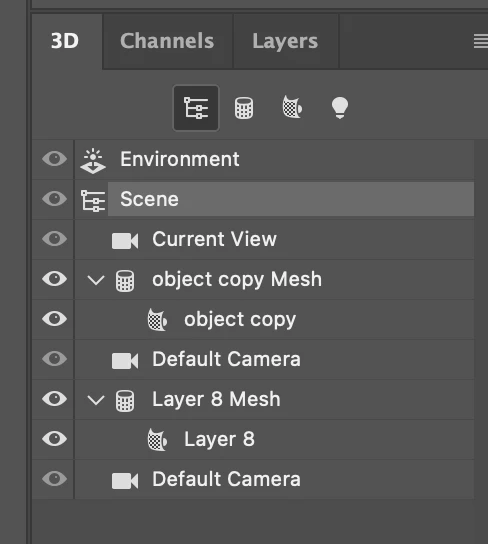 I am trying to do some simple 3D work in photoshop and running into an issue. When I enter into the 3D workspace, I can't see what I am doing. If I render, the layers I am trying to work with do appear. But as you can see, the current view, the cameras, scene, and evironment are greyed out.
