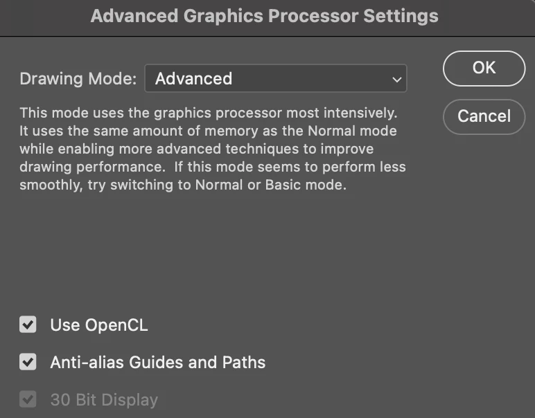"Use graphics processor" is grayed out. If I open up the Perfomance preferances before opening this .psb file, they are not grayed.