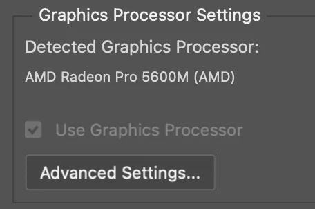 Adobe Photoshop Version: 22.4.2 20210602.r.242 a4f6042 x64 Number of Launches: 0 Operating System: Mac OS 11.4.0 System architecture: Intel CPU Family:6, Model:14, Stepping:13 with MMX, SSE Integer, SSE FP, SSE2, SSE3, SSE4.1, SSE4.2, AVX, AVX2, HyperThreading Physical processor count: 8 Logical processor count: 16 Processor speed: 2400 MHz Built-in memory: 65536 MB Free memory: 34949 MB Memory available to Photoshop: 60316 MB Memory used by Photoshop: 70 % SAM SDK Version: 2.0.0-main.480 ACP.local Status: - SDK Version: 1.45.1 - Core Sync Status: Reachable and compatible - Core Sync Running: 4.14.0.17 - Min Core Sync Required: 4.3.28.24 ACPL Cache Config: - Time to Live: 5184000 seconds - Max Size: 20480 MB - Purge Percentage: 50% - Threshold Percentage: 85% - Purge Interval: 60 seconds Live Edit Client SDK Version: 3.80.01 Manta Canvas: Enabled. Alias Layers: Disabled. Modifier Palette: Disabled. Highbeam: Enabled. Touch Bar Property Feedback: Enabled. Image tile size: 1024K Image cache levels: 4 Font Preview: Medium TextComposer: Latin ------- GPU