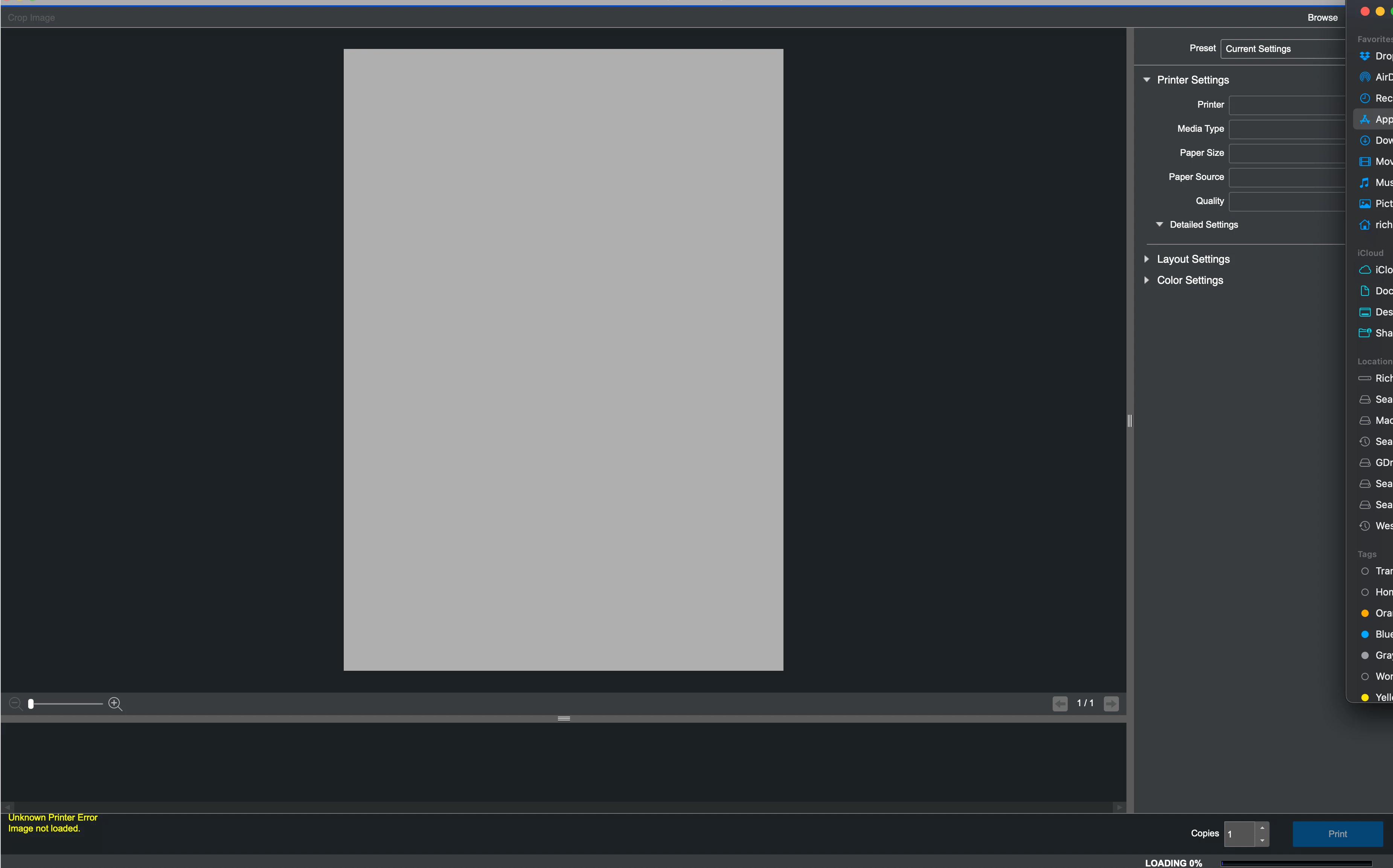 I have tried uninstalling and reinstalling the printer drivers and the same with the Epson Print Layout. The print never loads and I get the attached error notice.