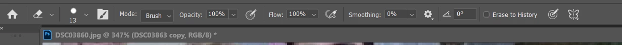 My eraser tool will only erase one dot (or just the shape of the brush, see photo) at a time. I hold to drag it and it doesn't flow at all. I click on click and erase. I've reset the tools mutiple times. Same thing happens with the brush tool. Here is a pic of my settings. I've found no answers online but "reset tool" and it hasn't worked for me.