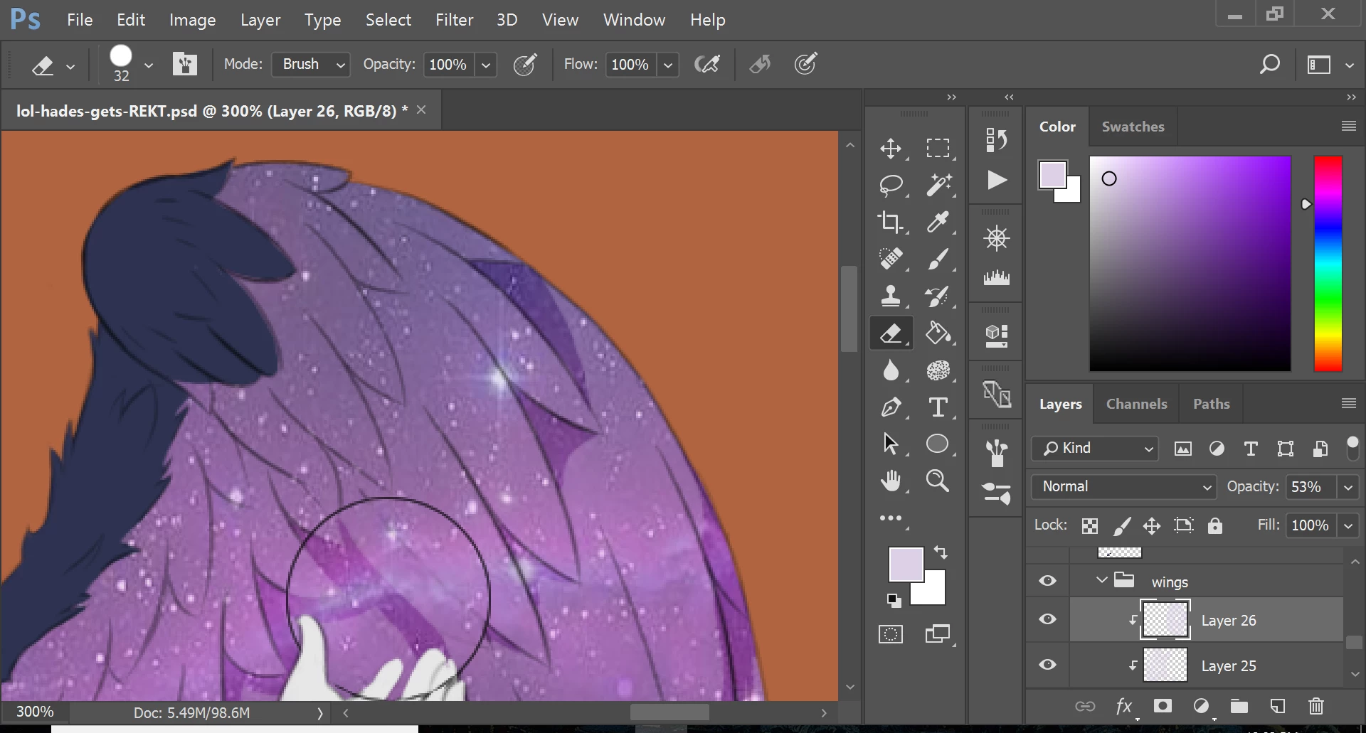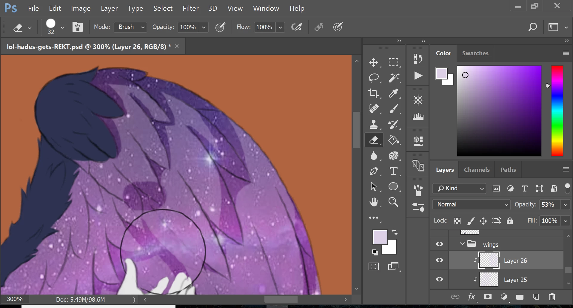 As you can see, it adds this erased bit where sensitivity seemingly turns off when it starts to lag. Now I don't know if this is happening because of the size of my file so far, 98.6M, but this has only been happening on this piece for the past week or so. It is very irritating and with the tablet I use, I can only go back once, and these little lag spikes put more than one eraser edit on the canvas.