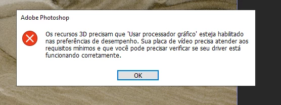 Quando tento ativar o filtro 3D - Gerenciar mapa normal aparece o erro: Os recursos 3D que "usar processador gráfico" esteja habilitado nas referências de desempenho. Sua placa de vídeo precisa atender aos requisitos mínimos e que você pode precisar verificar se seu driver está funcionando corretamente.