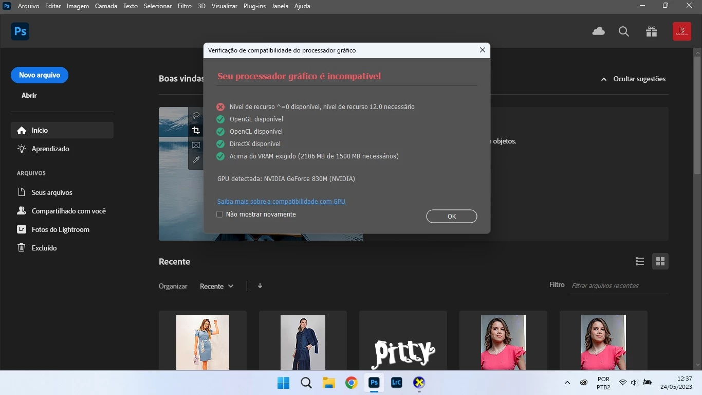 @Mix Nativa the GeForce 830M DirectX feature level is only 11.0, Photoshop requires a GPU with full DirectX 12 support, DirectX 12 is part of the Microsoft operating system, but your GPU does not fully support DirectX 12