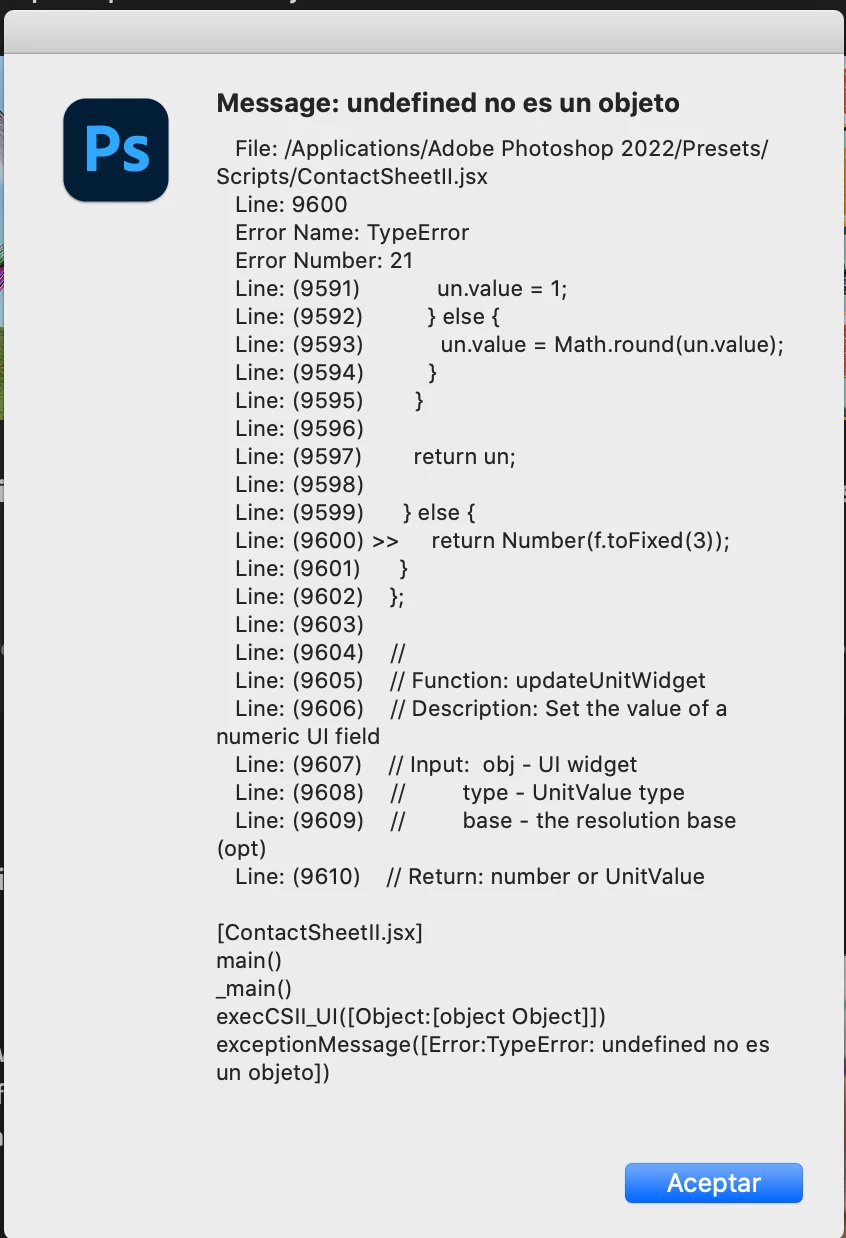 Resetting preferences doesn't work, I get the error when clicking Contact sheet II button, I don't get the settings dialog I just get the error
