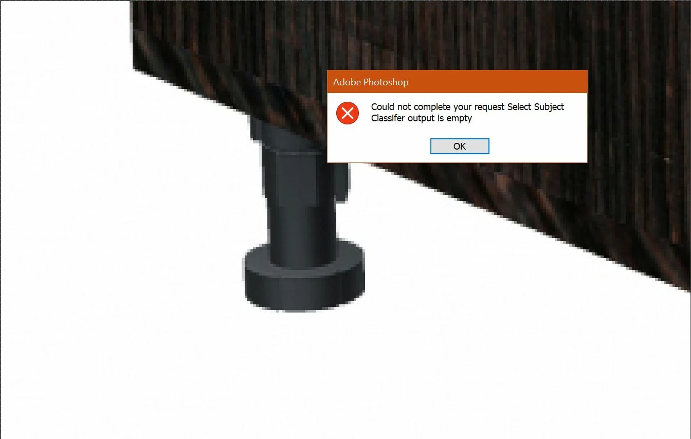 It happens whenever I try to use the tool over that leg of the furniture. It happened with other stuff too. Like, I tried to object select something that wasn't recognized by the tool directly, and it doesn't let me. I can't seem to be able to solve this issue... I also can't seem to find anybody else who has this. By the way it looks it seems like a minor mistake from my part, might have forgot something or so, but I can't seem to find what I "forgot". I tried restarting both Photoshop and Windows. Doesn't seem to work.