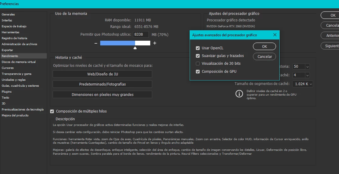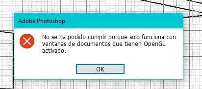 Buenas Noches, redacto este problema pues ultimamente Photoshop me da un error que dice (No se ha podido cumplir porque solo funciona con ventanas de documentos que tienen OpenGL activado.) El problema es que cuando reviso si ya no es compatible con mi gpu aparece que mi procesador grafico si los es. OpenGL, OpenCL, DirectX y Vram.(Gpu NvidiaQuadroK2000D). Al revisar la informacion del sistema no me aparece la opcion de OpenGL y solamente la de OpenCL. PUes no puedo ni rotar el lienzo y cuando me muevo a traves de este la imagen se corta. Ayuda porfavor.