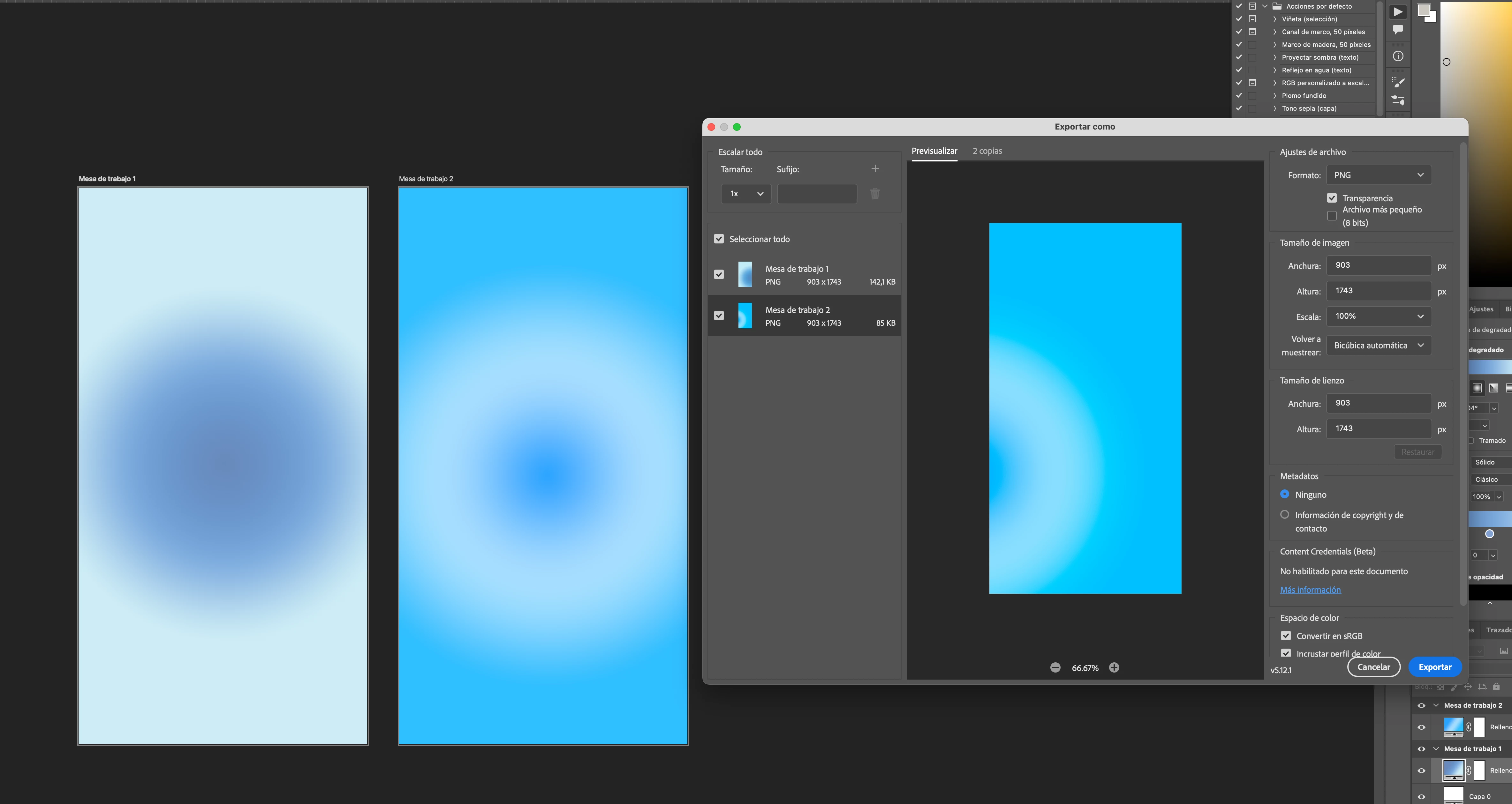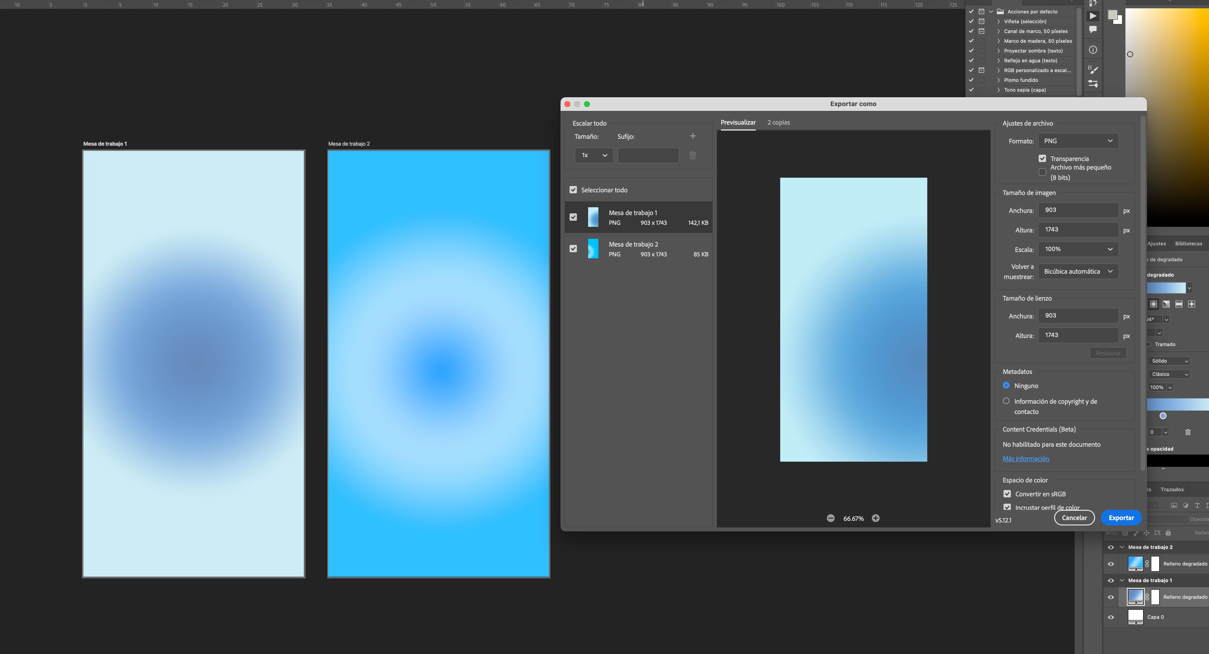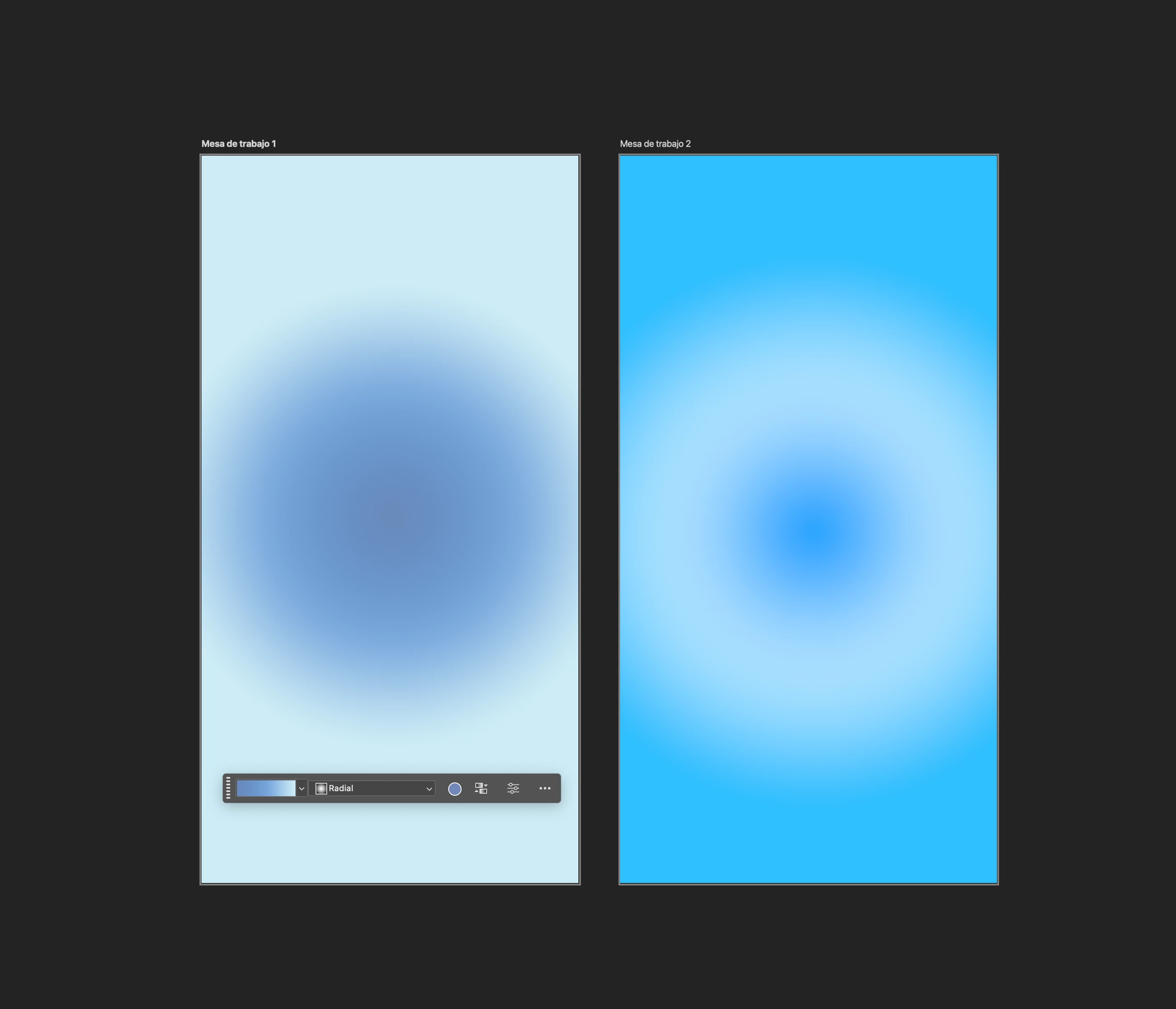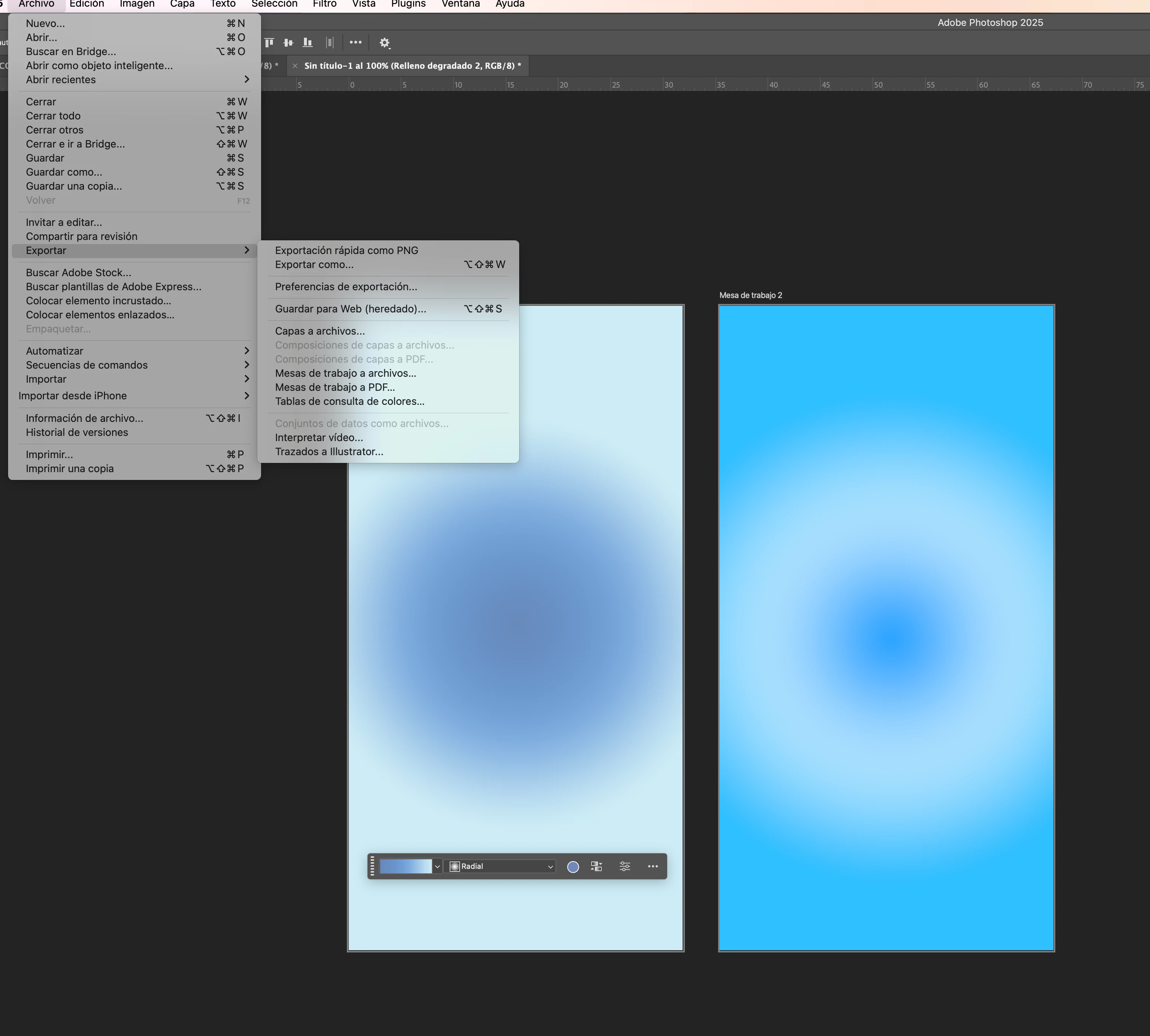 En un archivo con 2 mesas de trabaja de gran tamaño, en cada mesa el fondo tenia degradado circular, al exportgar el degradado circular cambio a lineal y no pude exportar el diseño original sin antes rasterizar la capa para que no generara un cambio en el diseño.