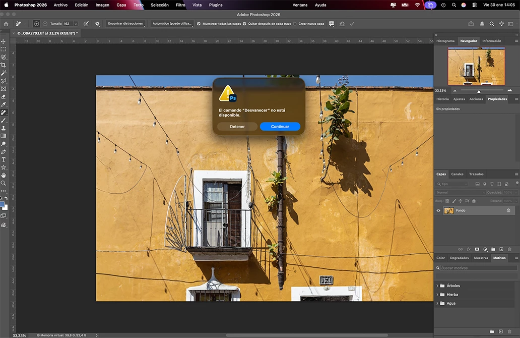 Error in Image Processor (command sequence). When I run a batch of files to convert them all, for example to JPG files, I get the message ‘The fade command is not available’ for each file, and I have to press Enter for each file.