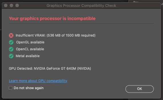 - Insufficient VRAM: (1073 MB of 1500 MB required)