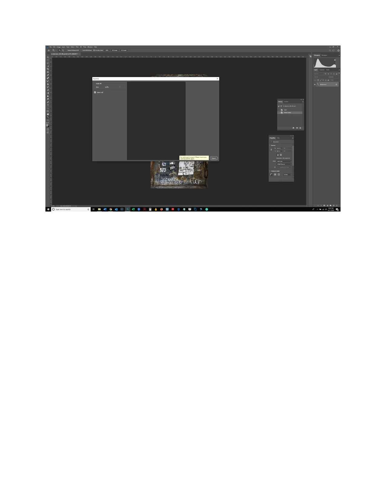 I am getting a message "no valid asset to export" when trying to "export as" in PS. I have this version: Adobe Photoshop Version: 21.1.2 20200410.r.136 2020/04/10: efaf3fa4e40 x64